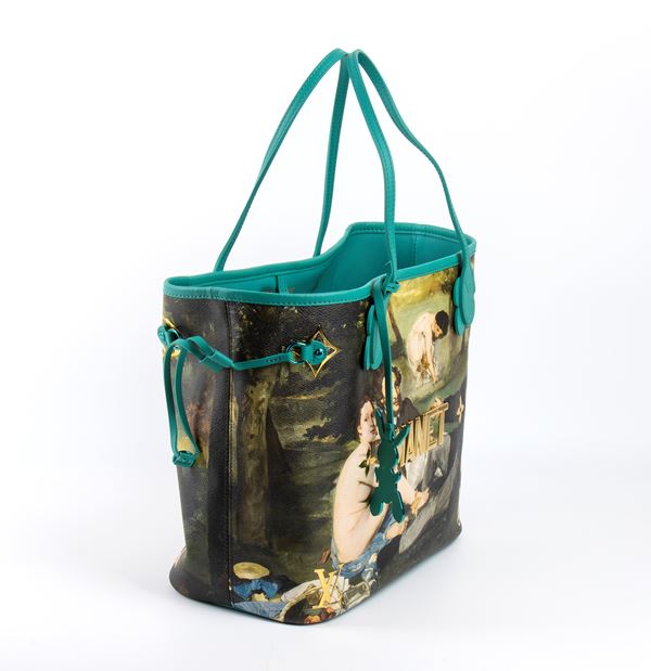 Louis Vuitton Neverfull MM Limited Edition Jeff Koons Limited Masters Collection Manet, the shopping bag is made of aqua green canvas and adorned externally with the exquisite Manet painting, adjustable leather tabs on the side of the bag, its interior is in aqua green leather with one zip pocket, one zip pocket, two flat pockets and one top closure with buckle closure, with dustbag and box.
