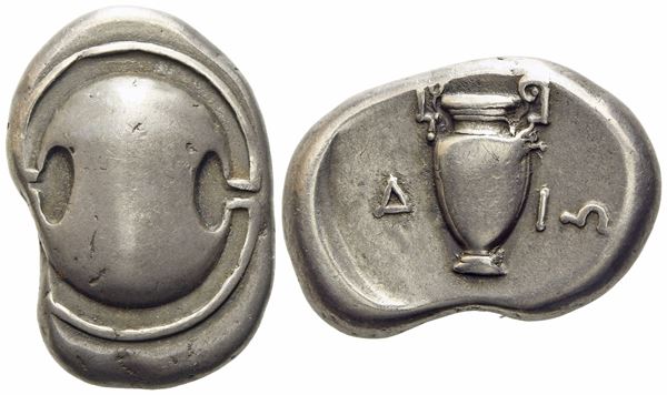 Dio–, magistrate. Boeotian shield; Rv. Amphora; Δ-IΩ across field; all within incuse concave circle. Hepworth 30; BCD Boiotia 471; HGC 4, 1330. Lovely old cabinet tone. Good very fine.