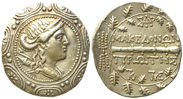 Amphipolis, 158-150 BC. Diademed and draped bust of Artemis r., bow and quiver over shoulder, all within tondo of Macedonian shield; Rv. ΜΑΚΕΔΟΝΩΝ ΠΡΩΤΗΣ, horizontal club, monograms above and below, all within oak wreath, thunderbolt to l. SNG Copenhagen 1314; AMNG 177; McClean 749. Traces of gentle cleaning, otherwise near extremely fine.