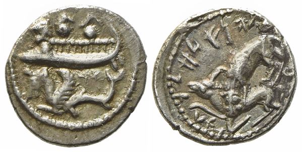 Galley l., containing two hoplites with helmets and round shields; below, hippocamp l.; Rv. Lion attacking bull l., Phoenician inscription above. BMC 8-9, pl. XII, 2 (reverse). Good extremely fine.