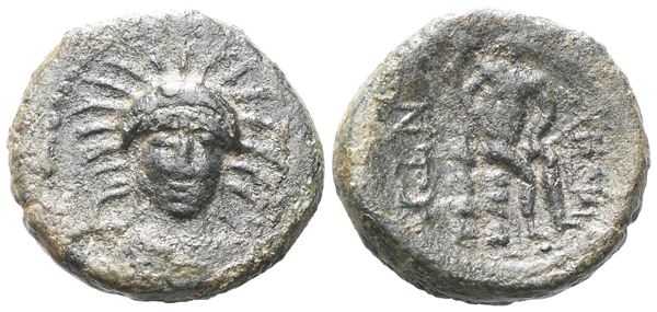 Sicily, Leontinoi, late 3rd - early 2nd century BC. Æ (18 mm, 3.08 g). Wreathed head of Dionysos r. R/ Warrior standing facing, holding spear and shield; cornucopia to r. CNS III, 11; SNG ANS 273; HGC 2, 717. Very Rare, green patina, Good Fine - near VF