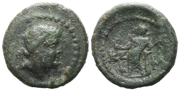 Sicily, Leontinoi, after 210 BC. Æ (20 mm, 9.93 g). Laureate and draped bust of Artemis r., with quiver over shoulder. R/ Demeter standing l., holding grain ears and torch; plow to l. CNS III, 21; HGC 2, 715. Rare, green patina, VF, Tooled