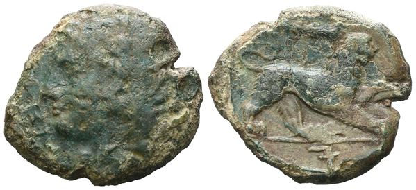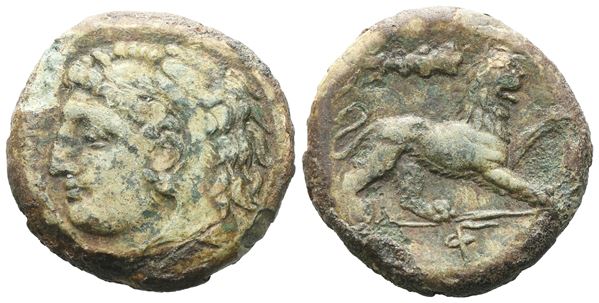 Sicily, Messana, 278-276 BC. Æ (20 mm, 6.26 g). Head of Herakles l., wearing lion skin. R/ Lion standing r., l. forepaw raised; club above, trident in exergue. CNS I, 23 Rs1; SNG ANS 396-8 var. (torch in ex.); HGC 2, 839 var. (same). VF