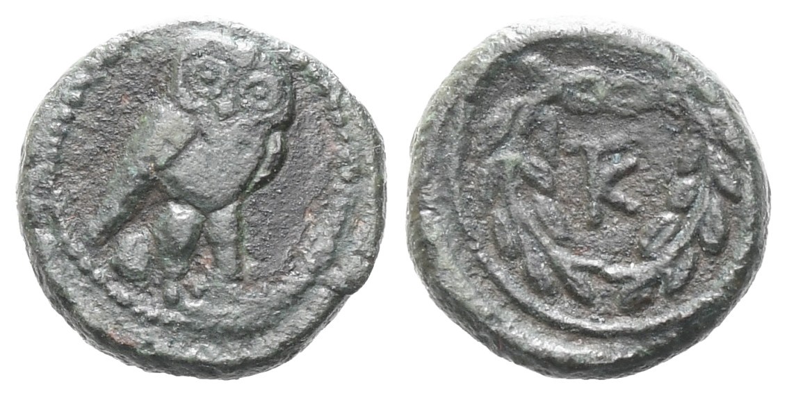 Sicily, Katane. Campanian mercenaries, c. 339/8 BC. Æ (10 mm, 1.19 g). Owl standing r., head facing. R/ KT monogram within wreath. CNS III, 2C; SNG ANS -; HGC 2, 631 corr. (monogram). Very Rare, green patina, near VF