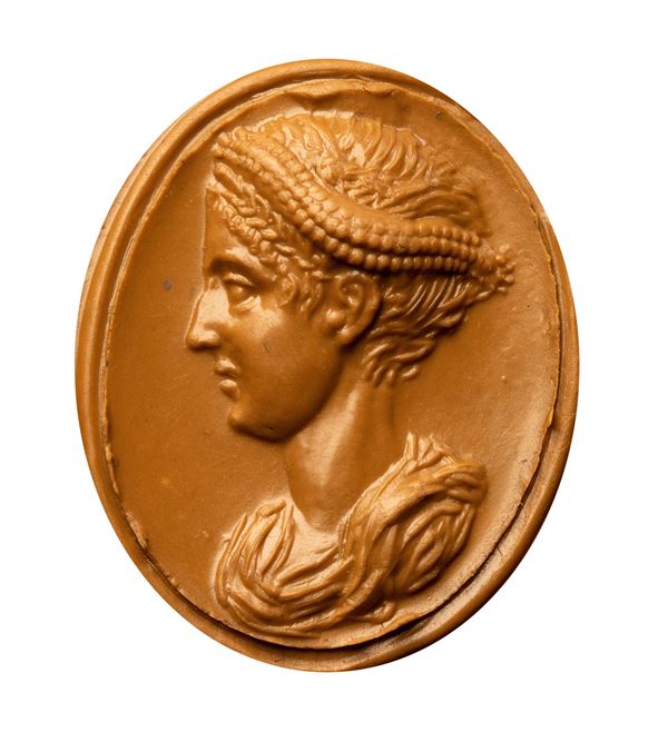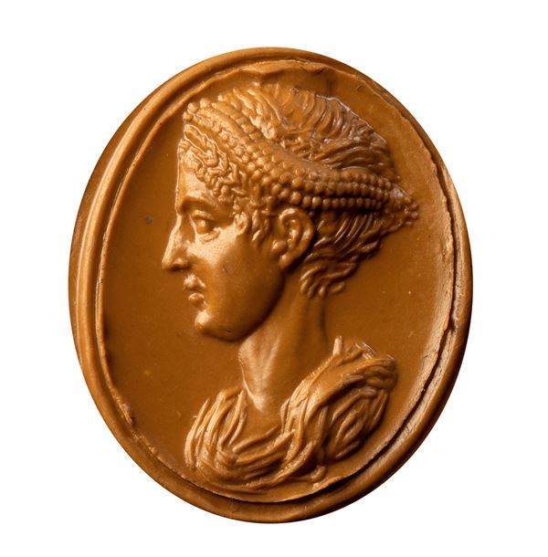 An important roman carnelian intaglio depicting the portrait of Sabine, wife of the emperor Hadrien, 2nd century A.D. This portrait recalls a series of her portraits with the same features; a long flexible neck springing from a chiton with undulating and shimmering folds, a youthful face, a majestic and somewhat cold bearing. The best example of this series is in the Sangiorgi collection. Others in the British Museum, showing slight variations. Here unlike the other copies of this series, it is an effigy with more mature features, a matron. We also find on each model, the wide braid composed of different hair bands that surround the head, the horizontal braids covering the top of the head, the small crochet locks frame the forehead. The portrait is engraved with great artistic and technical execution. The stone has minor chips on the edge, and significant wear marks, slightly burnt. Set in a later collector gold ring.