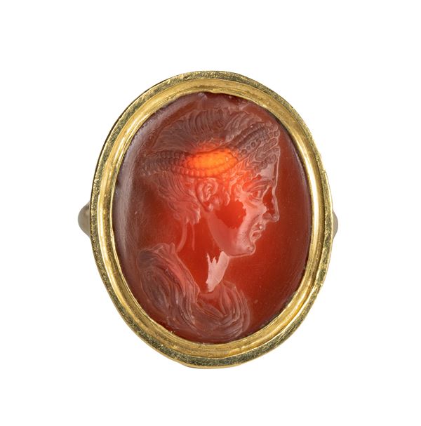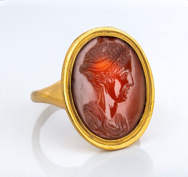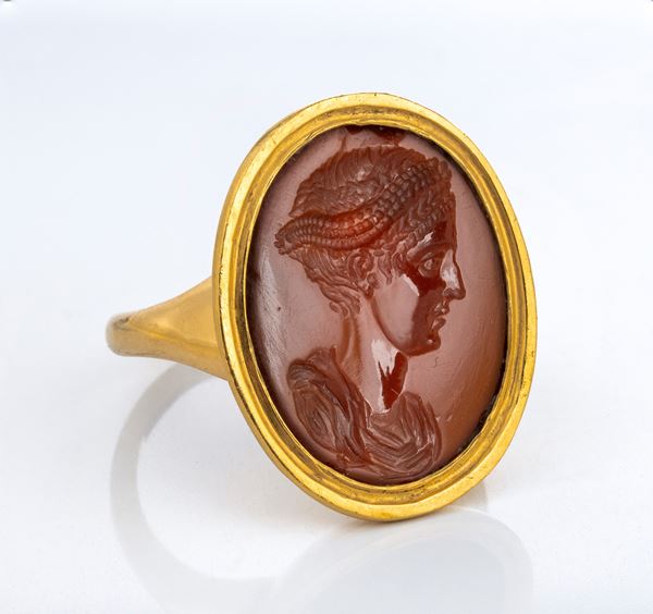 A fine Roman carnelian intaglio set in a modern gold ring. Portrait of the empress Sabina., Mid 2nd century A.D.