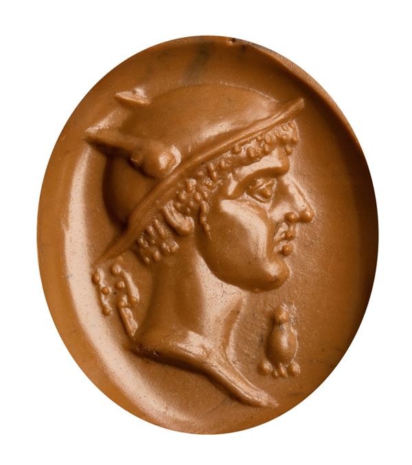 The deity wears the winged petasus, facing left, with his attributes. Behind the neck, the caduceus. In front, the coin purse. Particularly refined execution, with very small globular elements that date this work to the late republican age. Vivid red color and mirror polish. Splendid portrait of Mercury. Slight wear marks