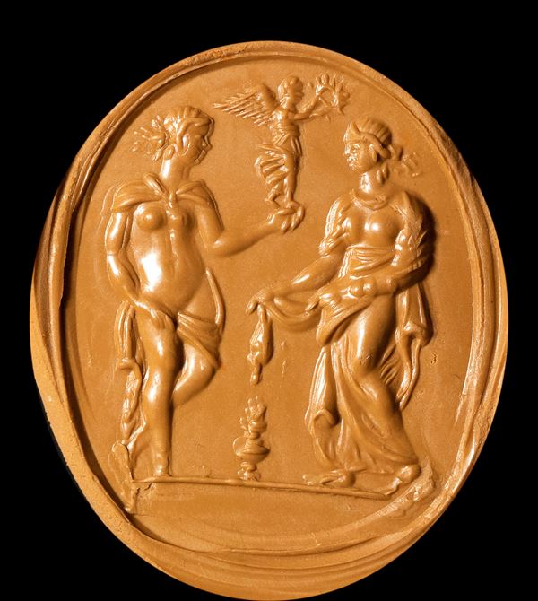 The scene consists of two female figures. On the left, a draped figure holds his robe over a small burning urn in a votive attitude; on the right, a partially draped female figure holds a winged victory with a laurel wreath in her right hand. The scene se