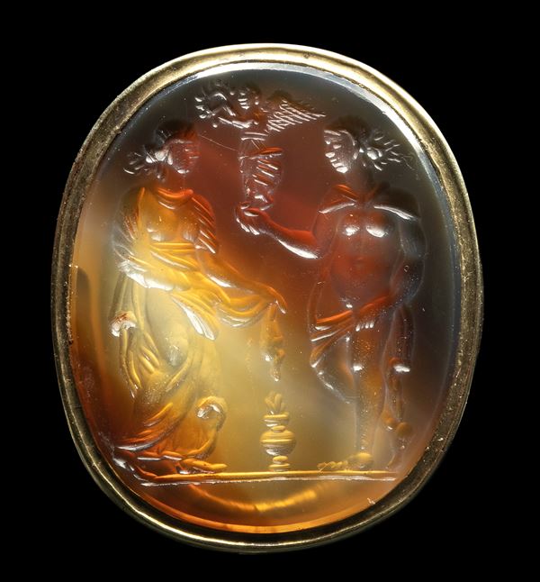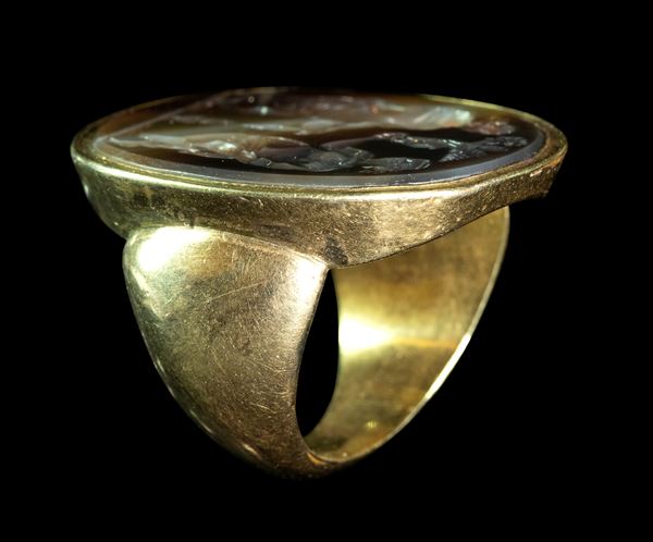 A large agate intaglio set in a gold ring. Allegorical scene., First half of 17th century.