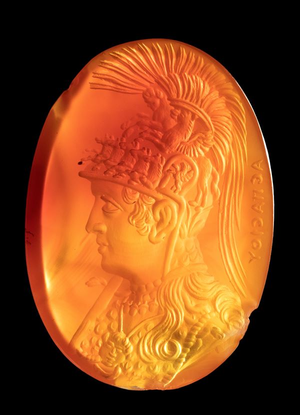 A large carnelian intaglio signed Aspasios. Bust of Athena Parthenos., 18th century.