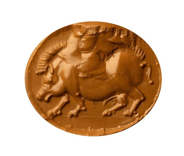 Large stone, chipped at the top. The animal has its typical massive build with globular incised details. Damaged but fascinating stone. Subject inspired by Greek and than by the Etruscan models, but slightly later. Wear marks.