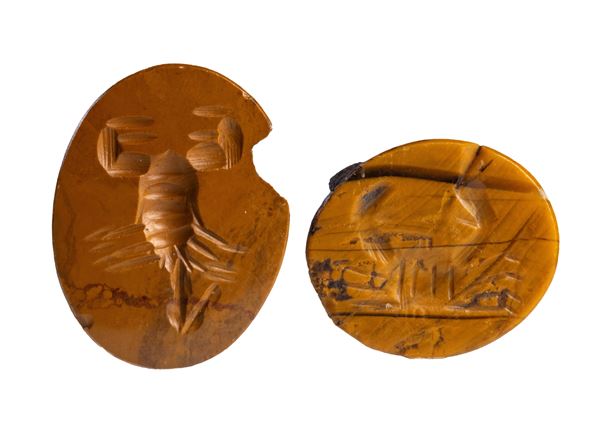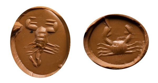 A lot of 2 Roman yellow jaspers intaglios. A crab and a scorpio., 2nd century A.D.