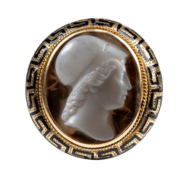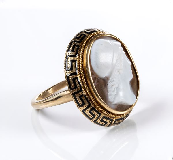 A Neoclassical agate cameo set in a gold and black enamel ring., Mid 19th century