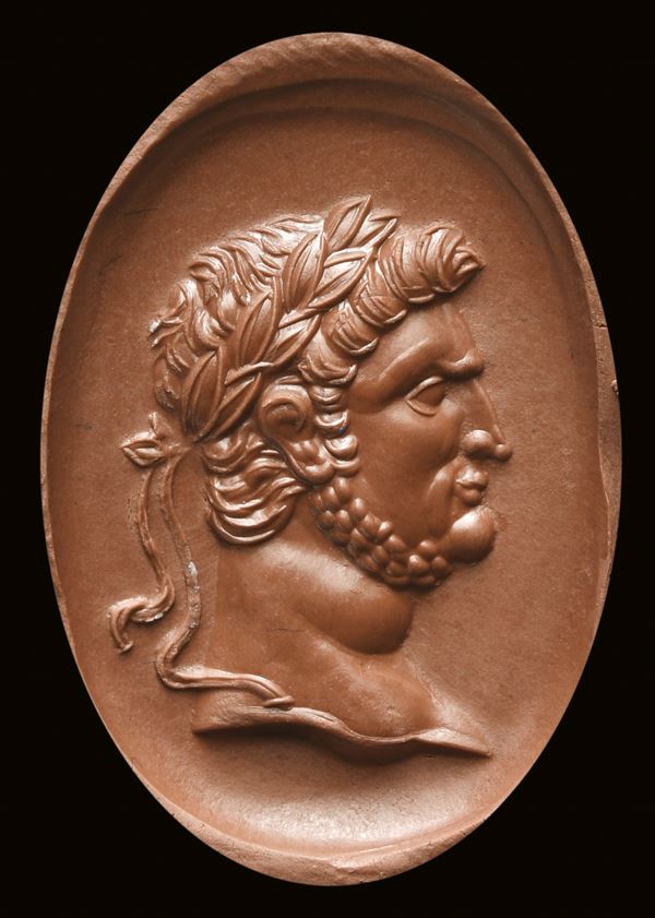 The emperor is turned on the left side and wears the laurel wreath with the ribbons hanging down over the neck. The subject is specifically inspired from the emperor's portraiture after the Roman coinage. Wear marks.