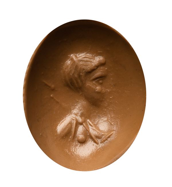 A Roman cabochon carnelian intaglio. Female bust., 1st century B.C.