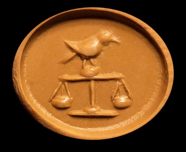 A bird stands on a scale, symbol of the Harmony and of the Justice, allegory of Balance. Wear marks.