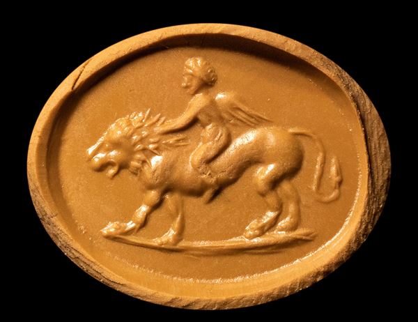 The mighty feline walks to the right, carrying a winged erote on its back. The erote grabs the lion's mane to hold on. Groundline. Allegory of AMOR OMNIA VINCIT. Slight wear marks.