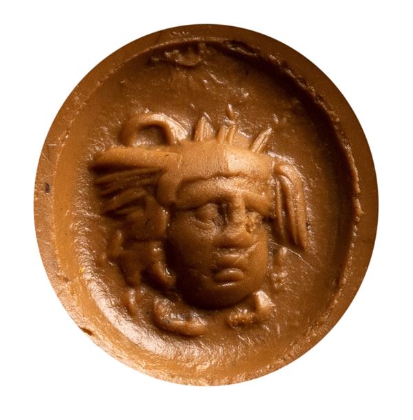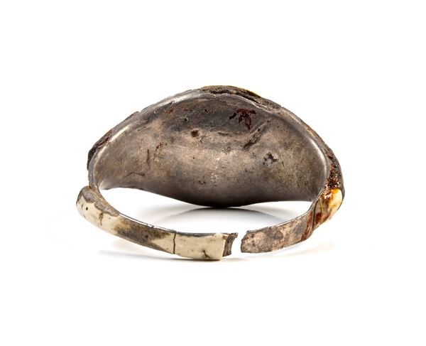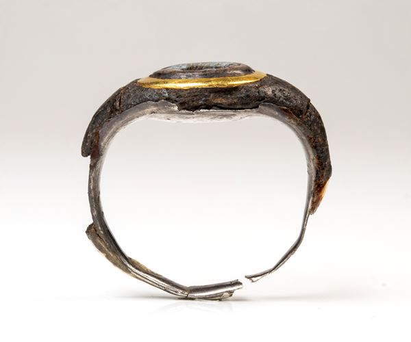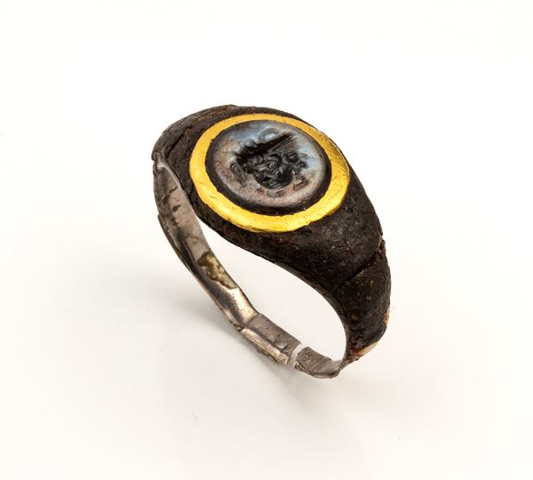 Iron ring with gold bezel rim, damaged and missing, unwearable and restored internally with a silver lining. A nicolo engraved with the head of Gorgona is set in the center. Deposits, missing parts and signs of wear.