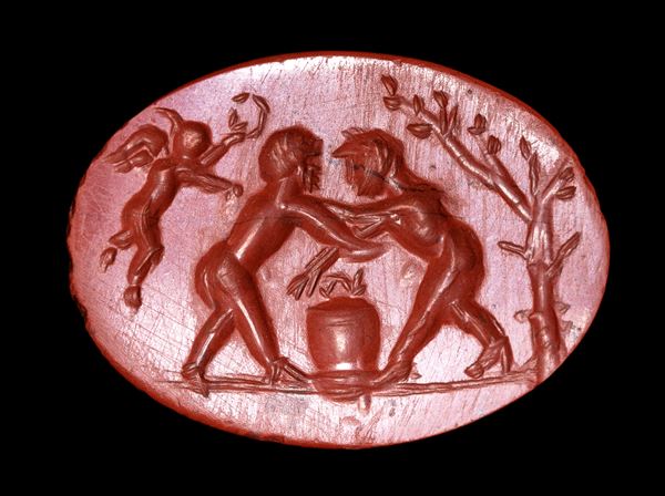 Two young characters fight in front of an altar. In the background, on the right, a tree; on the left, a winged erote raising a laurel wreath for the next winner. Groundline. Well composed scene. Attractive color of the stone. Slight wear marks.