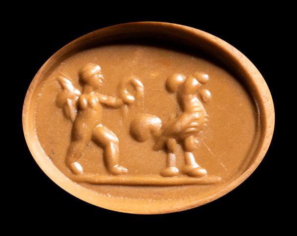 A Roman red jasper intaglio. Winged eros with rooster., 1st - 2nd century A.D.