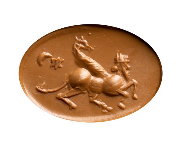 A Sasanian carnelian intaglio. Hybrid figure with attributes., 5th-6th century A.D. or later.