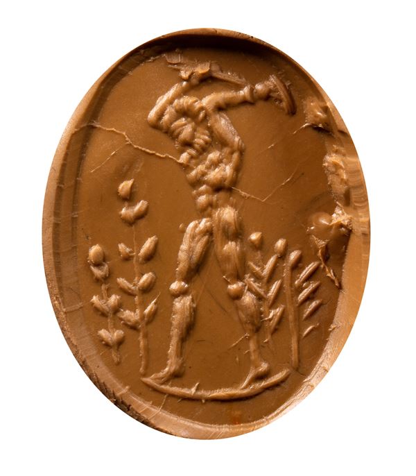 A naked male character is working among the plants with a tool. Wear marks and crack of the stone.