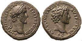 ANTONINVS AVG PIVS PP TR P COS III Laureate bust of Antoninus Pius to r.; Rv. AVRELIVS CAESAR AVG PII F COS Bare bust of Marcus Aurelius to r., SC below neck truncation. RIC 1222; Cohen 29, 31. Rare. Chocolate brown patina. Gently smoothed. Near extremely fine.