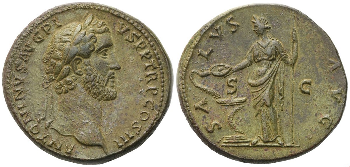 ANTONINVS AVG PIVS P P TR P COS III Laureate head of Antoninus Pius to r.; Rv. SALVS AVG Salus standing l., feeding snake from coiled round altar with right and holding sceptre in l.; S - C across fields. RIC 635; Cohen 710. Beautiful green patina with darker hues. Exceptional condition. Untouched. Portrait of refined style. Good extremely fine / near FDC