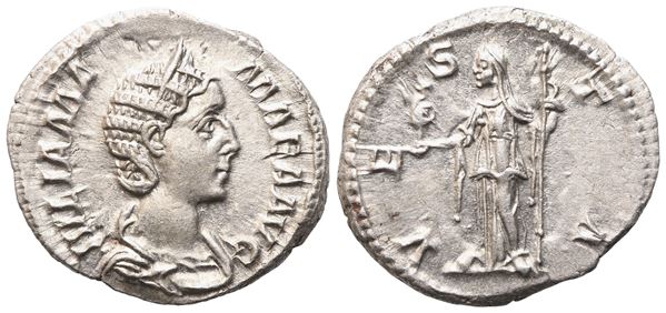 IVLIA MAMAEA AVG Diademed and draped bust of Julia Mamaea r.; Rv. VESTA Vesta, veiled, draped, standing l., holding palladium in r. hand and up-right sceptre in l. hand. RIC 360; Cohen 81. Extremely fine.