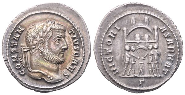 DN LEO PERPET AVG Pearl-diademed, helmeted and cuirassed bust facing slightly to r., holding spear and shield decorated with horseman motif; Rv. VICTORIA AVGGG Є Victory standing to l., holding long jewelled cross; star in r. field, CONOB in exergue. RIC 605; Depeyrot 93/1. Extremely fine.