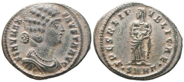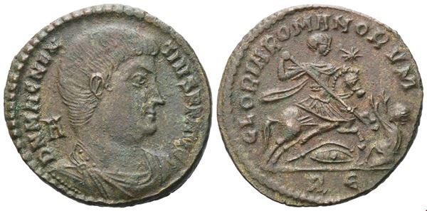 D N PLA VALENTI - NIANVS P F AVG Rosette-diademed, draped, and cuirassed bust r.; Rv. VICTORI - A AVGGG Emperor standing facing, holding long cross and Victory on globe, r. foot on human-headed coiled serpent; R-V across fields; COMOB in exergue. RIC X 2019. Good extremely fine.