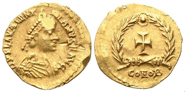 D N IVSTINI-ANVS PP AVG Pearl-diademed, draped and cuirassed bust of Justinian r.; Rv. VICTORIA AVGVSTORVM Victory advancing to r., head l., wreath in r. hand, globus cruciger in l., star in r. field; CONOB in exergue. Cfr. DOC 19; cfr. MIBE 19; cfr. SB 145. XF. Due to the light weight, it could be [..]