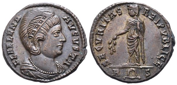 VLIA MAMAEA AVGVSTA Diademed and draped bust of Julia Mamaea to r.; Rv. FELICITAS PVBLICA / S C Felicitas standing front, head to l., legs crossed, holding a caduceus in her r. hand and leaning on column with her l. elbow. RIC 676; Cohen 21. Lovely blue-green patina. About extremely fine.