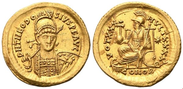 D N ANASTAS-IVS PP AVG Pearl-diademed, helmeted and cuirassed bust of Anastasius r.; Rv. VICTORIA AVGVSTORVM Victory advancing to r., head l., in r. hand holds wreath, in l. hand a globus cruciger, star in r. field; CONOB in exergue. DOC 10a; MIB 12; SB 8. Good extremely fine.