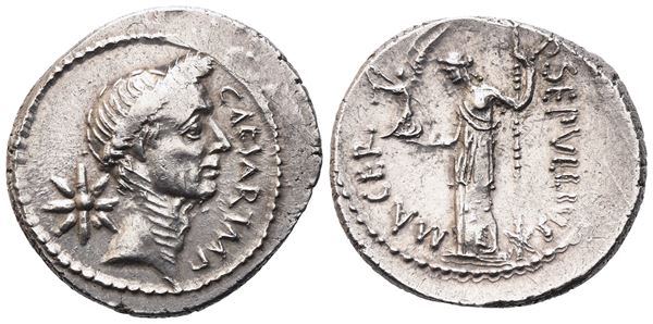 Military mint traveling with Caesar in northern Italy. Elephant advancing r., trampling horned serpent; in exergue, CAESAR; Rv. Culullus, aspergillum, securis (axe surmounted by dog or wolf's head), and apex. Crawford 443/1; Babelon (Julia) 9; Sydenham 1006. Extremely fine. Lustrous metal.