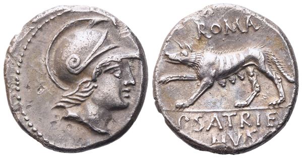 Helmeted head of Roma r.; Rv. She wolf l., r. forepaw raised; above, ROMA; in exergue, P·SATRIE / NVS. Crawford 388/1a; Babelon (Satriena) 1; Sydenham 781. Extremely fine.