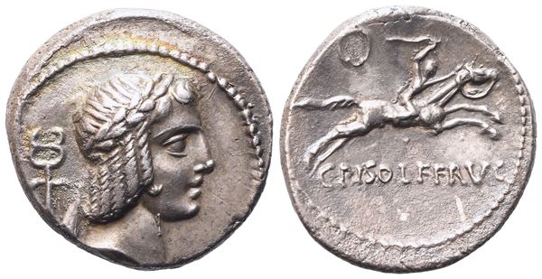 Laureate head of Apollo r., winged caduceus behind; Rv. Naked horseman galloping r., holding whip over head, neck torque in field above; below, C·PISO·L·FRVG. Crawford 408/1 (O30/R29); RSC 24h. Extremely fine.