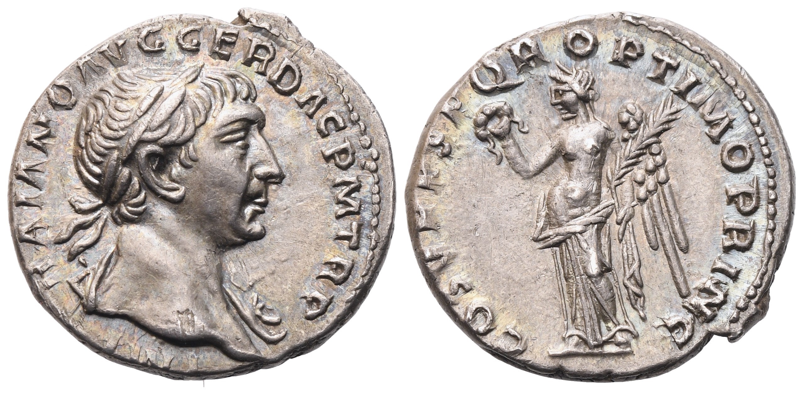 IMP TRAIANO AVG GER DAC P M TR P Laureate bust r., slight drapery on far shoulder; Rv. COS V PP SPQR OPTIMO PRINC Victory standing l., holding wreath with r. hand and palm branch with l. RIC.128; Cohen 75. Good extremely fine.