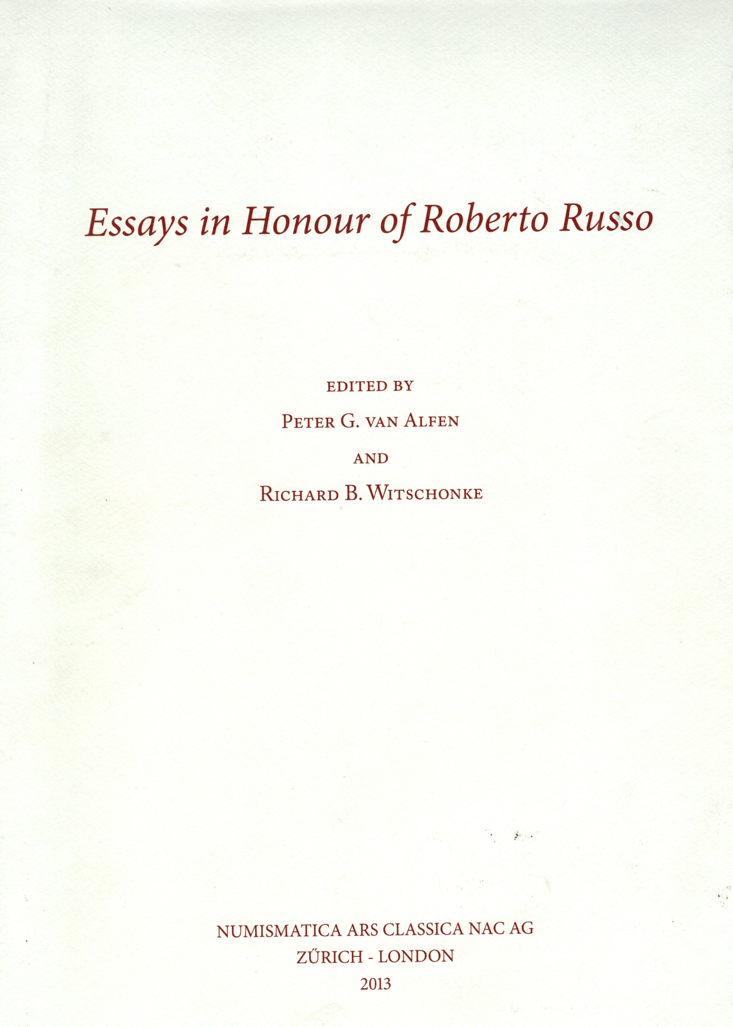 AA.-VV. - Essay in honor of Roberto Russo. Zurich-London, 2013. pp. xviii - 408, plates and illustrations in the text. ril ed. Dust jacket slightly soiled, interior in excellent condition. important works of Republican Greek and Roman coinage with important authors of authors; Keith Rutter, Christof Boehringer, Alberto Campana, Giovanni Santelli, John Morcom, Haim Gitler, David Vagi, Andrew Burnett, Andrew McCabe, Richard Schaefer, Andrea Pancotti, Roberto Russo, T. V. Buttrey, Richard Witschonke, Clive Stannard, Bernhard E. Woytek, Michel Amandry, Frank L. Kovacs, and Lucia Travaini.
