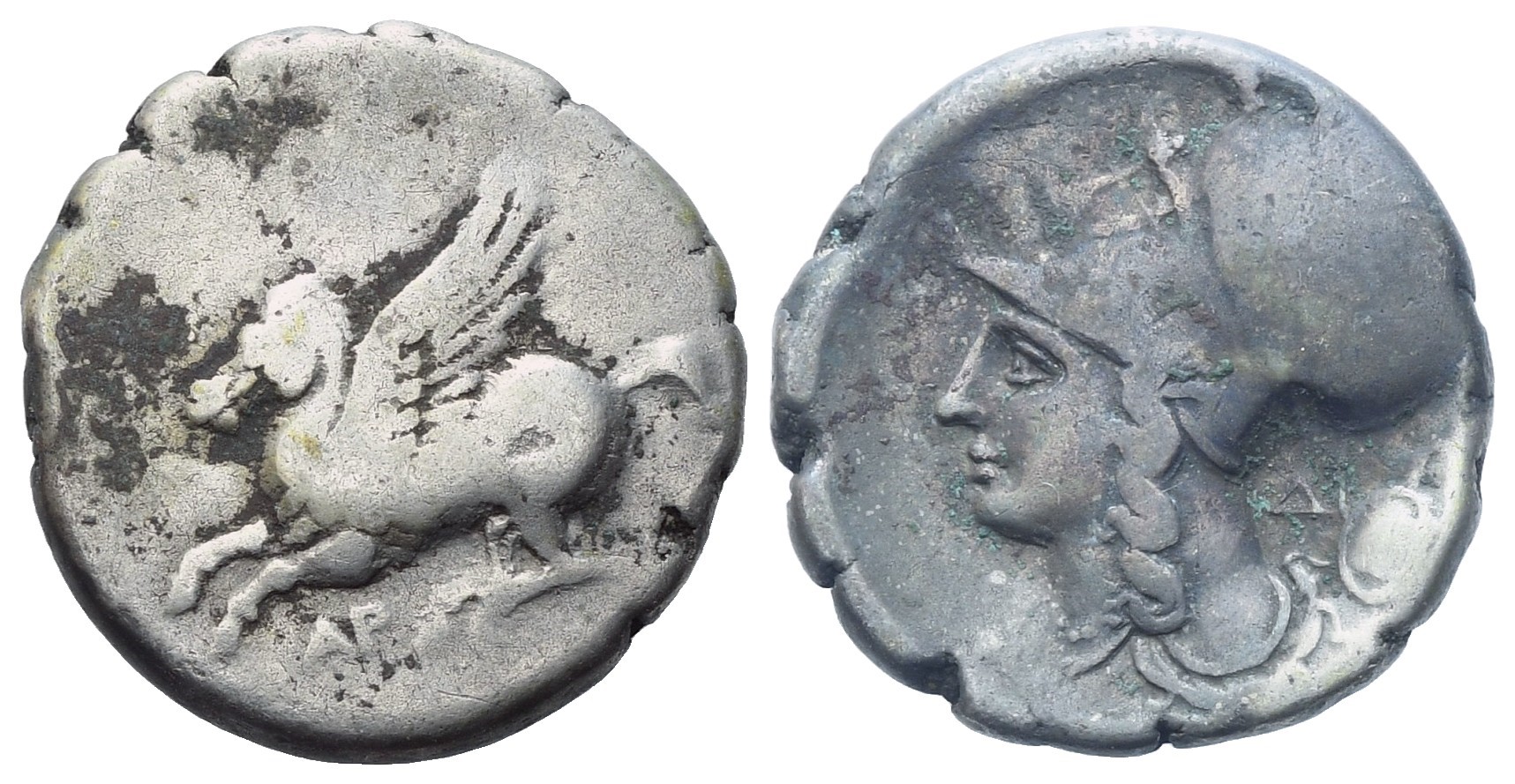Pegasos flying l.; AP below; Rv. Helmeted head of Athena left; ΞΞ and shield to r. Pegasi 16; BCD Akarnania -; HGC 4, 786. VF