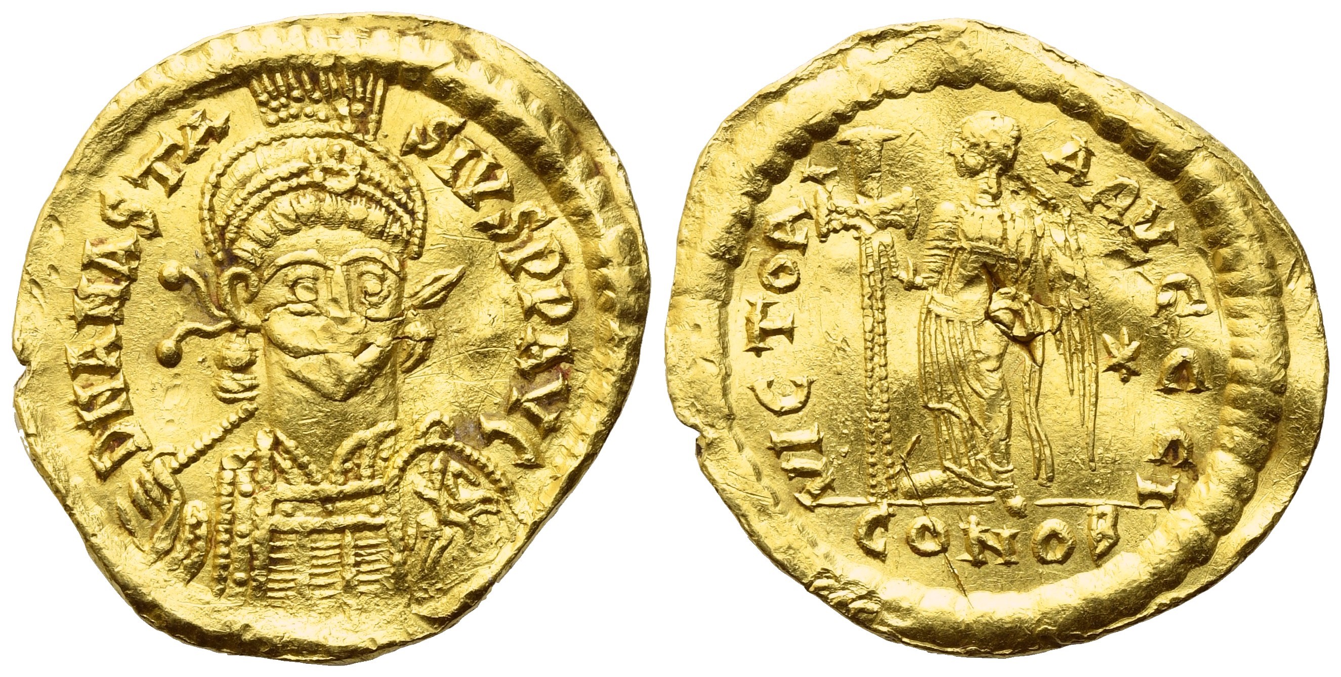 D N ANASTAS-IVS PP AVG, pearl-diademed, helmeted and cuirassed bust of Anastasius facing, head slightly right, holding spear over right shoulder and on left arm shield with horseman motif; Rv./ VICTORI-A AVCCC I, Victory standing left, holding jeweled cross; star to lef; CONOB in exergue. DOC 7h; SB 5. aEF, slightly bent.