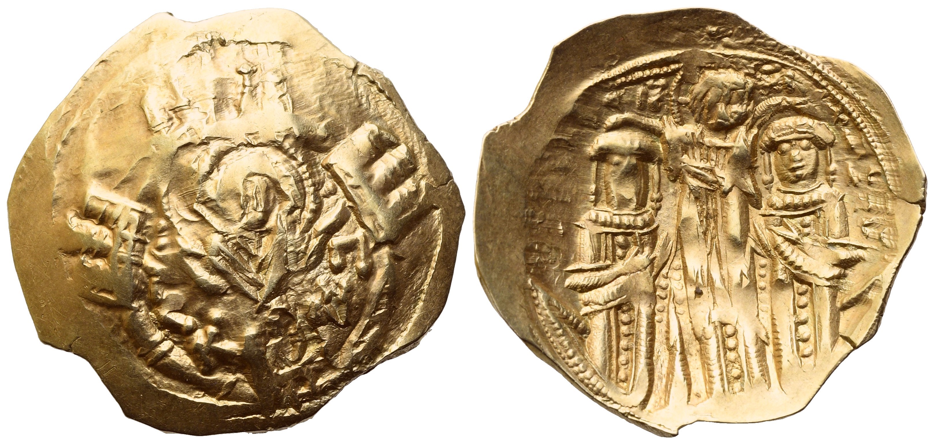 Bust of Virgin Mary, orans, flanked by MHP and ฮV,all within city walls furnished with six groups of towers. Rv./ Christ blessing Andronicus II and Michael IX, kneeling to left and right, respectively; in fields, IC - XC with the names of the emperors below. DOC 367. SB 2396. gVF / aEF