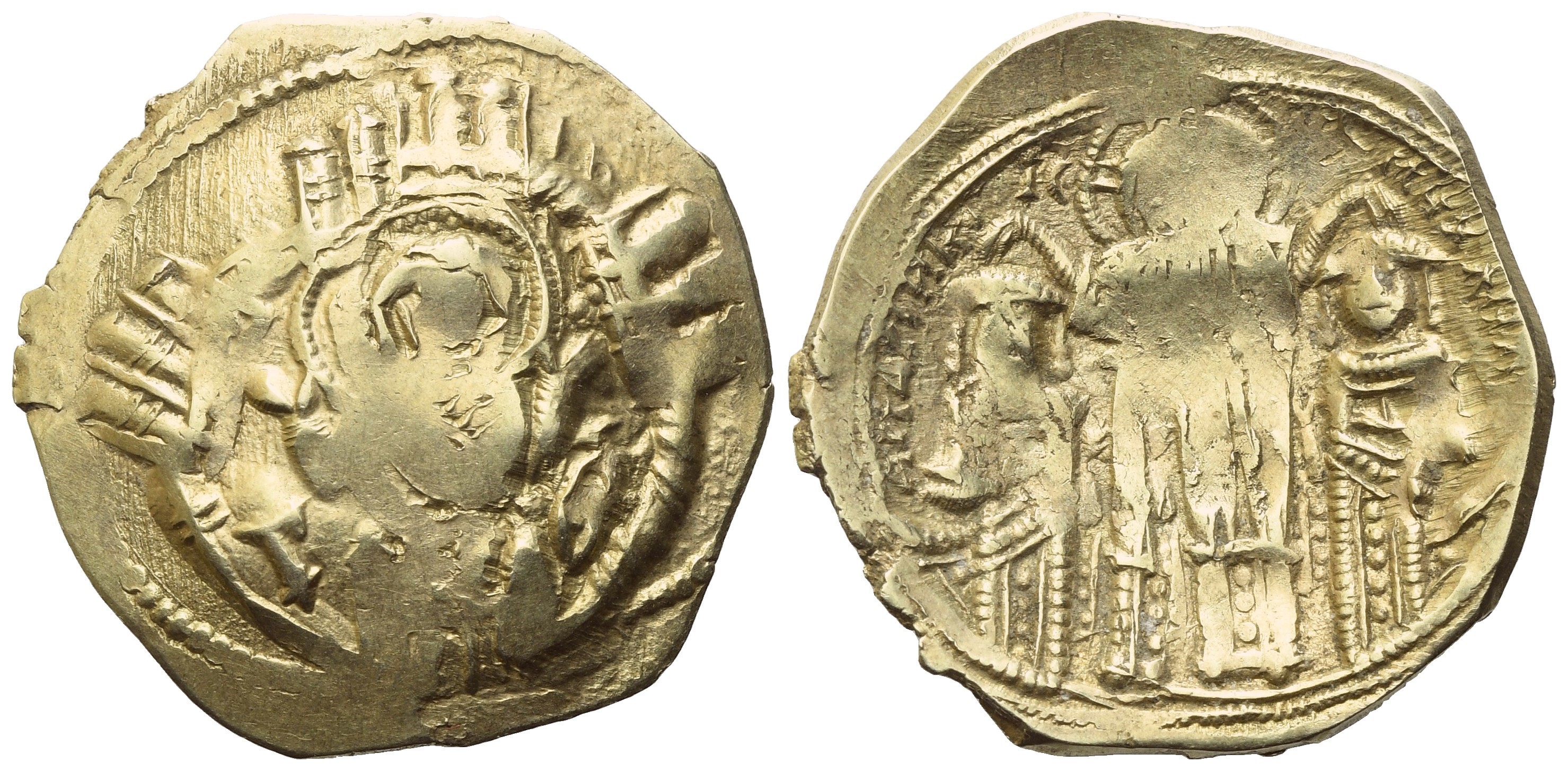 Bust of Virgin Mary, orans, flanked by MHP and ฮV,all within city walls furnished with six groups of towers. Rv./ Christ blessing Andronicus II and Michael IX, kneeling to left and right, respectively; in fields, IC - XC with the names of the emperors below. DOC 367. SB 2396. gVF