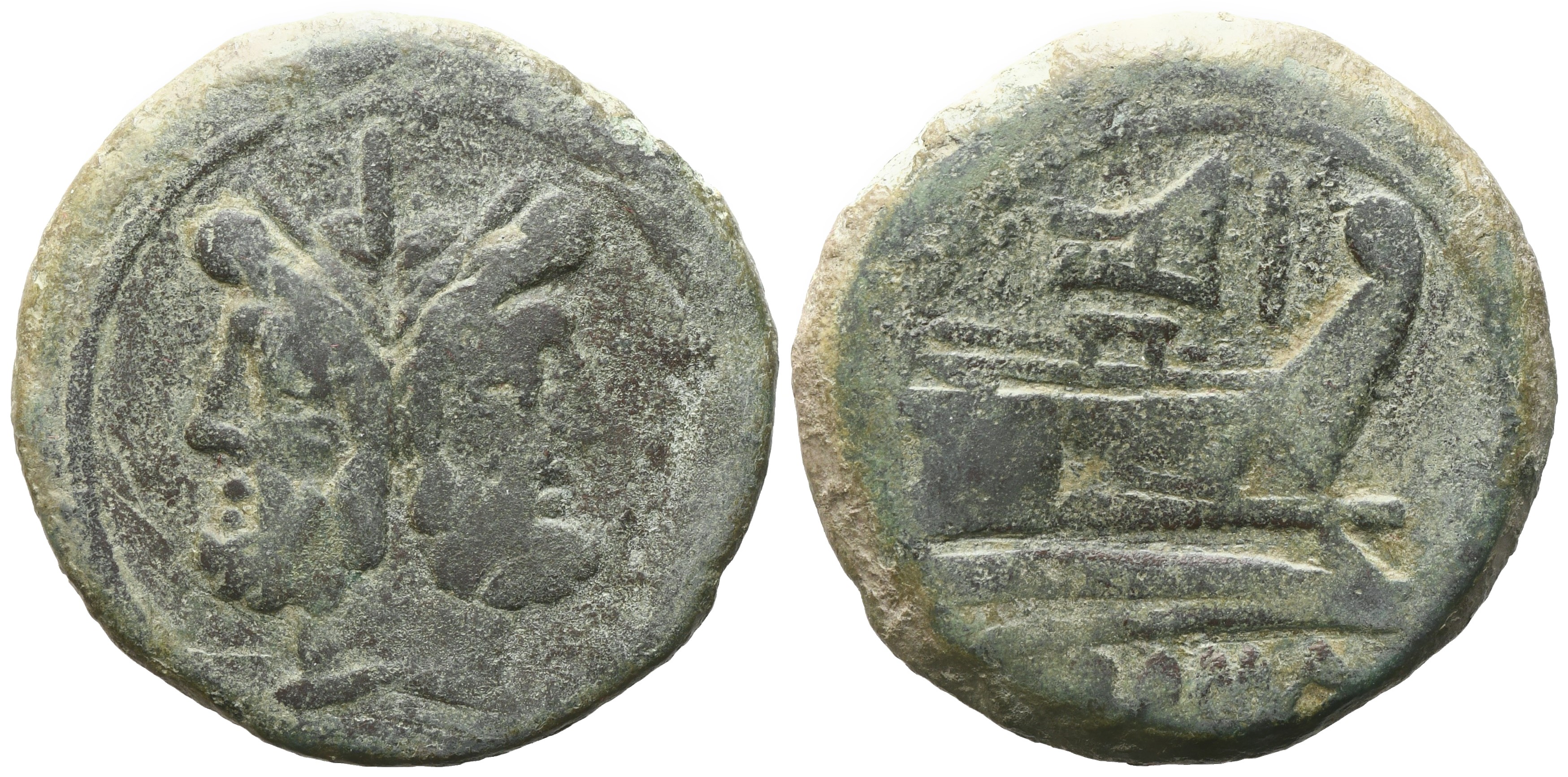 Mint: Rome. Laureate head of bearded Janus; I (mark of value) above; Rv. Prow of galley right; above, rostrum tridens and I (mark of value). Crawford 114/2; Sydenham 245; RBW 523. Light green patina. Very fine.