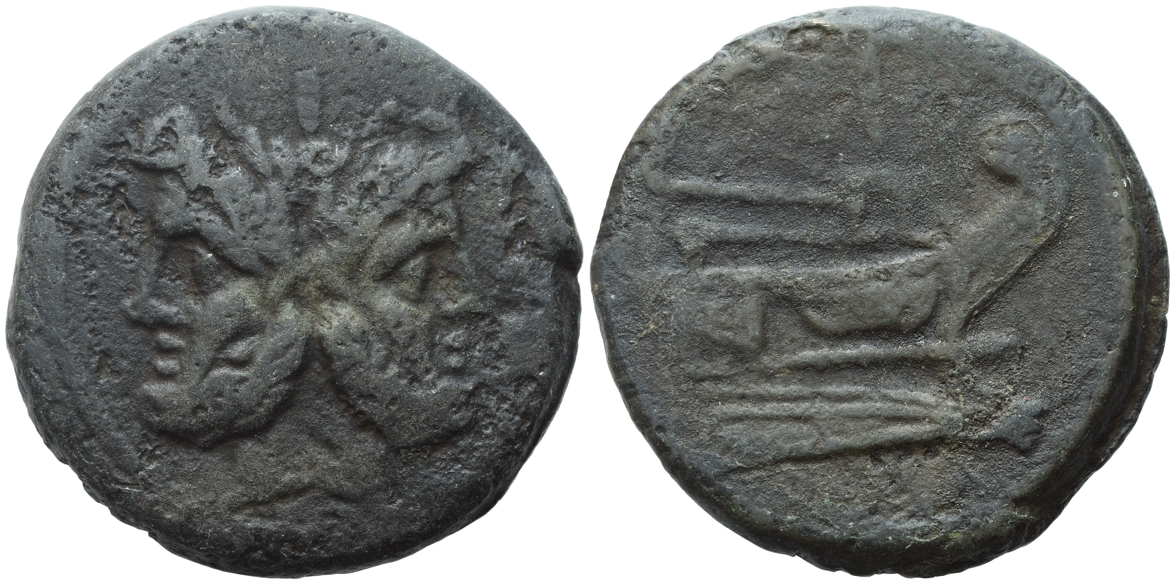 Laureate head of Janus r.; above, I- Prow r.; above, I; below, ROMA. Crawford 56/2 ss. Dark patina. Very fine / near very fine.