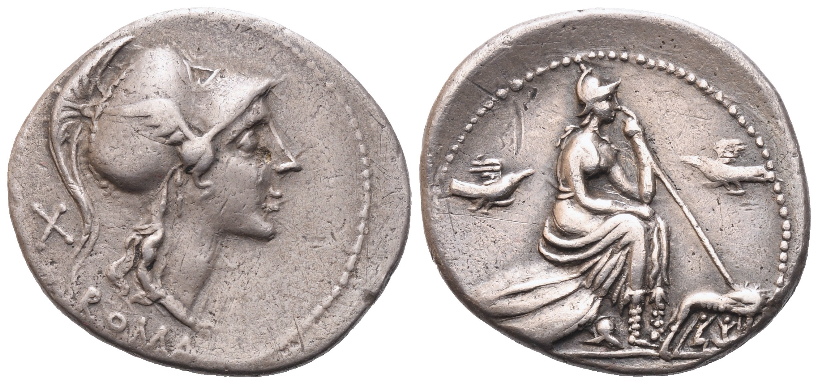 Head of Roma r., wearing winged Corinthian helmet; behind, X (mark of value) and below, ROMA; Rv. Roma seated r. on pile of shields, holding spear in l. hand; at her feet, helmet and before, she-wolf suckling Romulus and Remus; on either side, bird flying. Crawford 287/1; Sydenham 530. VF / gVF