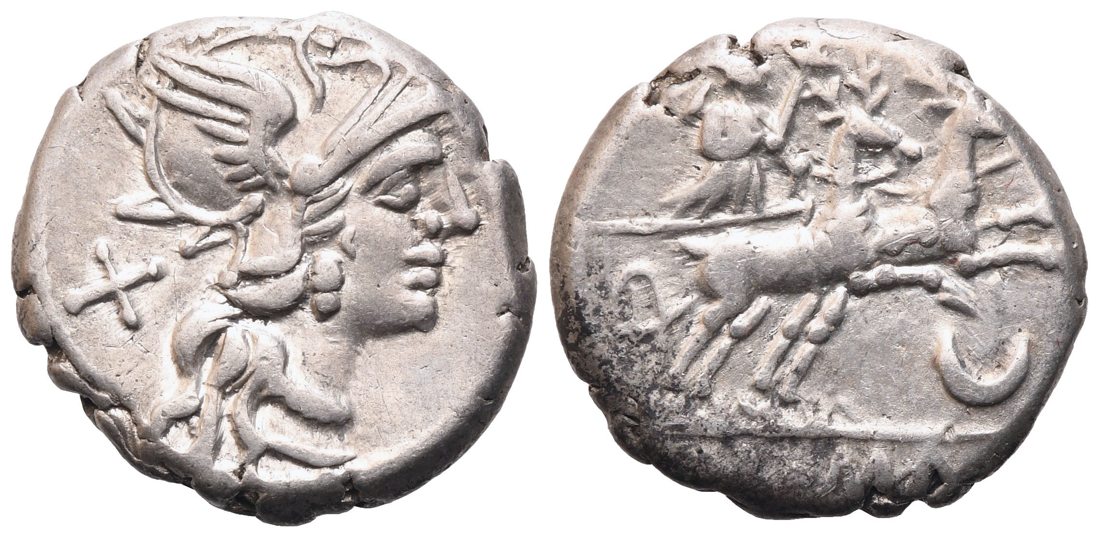 Helmeted head of Roma R.; behind, X (mark of value); Rv. Diana, with quiver on shoulder, in biga of stags r., holding reins in l. hand and torch in r. hand; below, crescent; in exergue, ROMA. Crawford 222/1; Sydenham 438; RSC 101. Very fine.