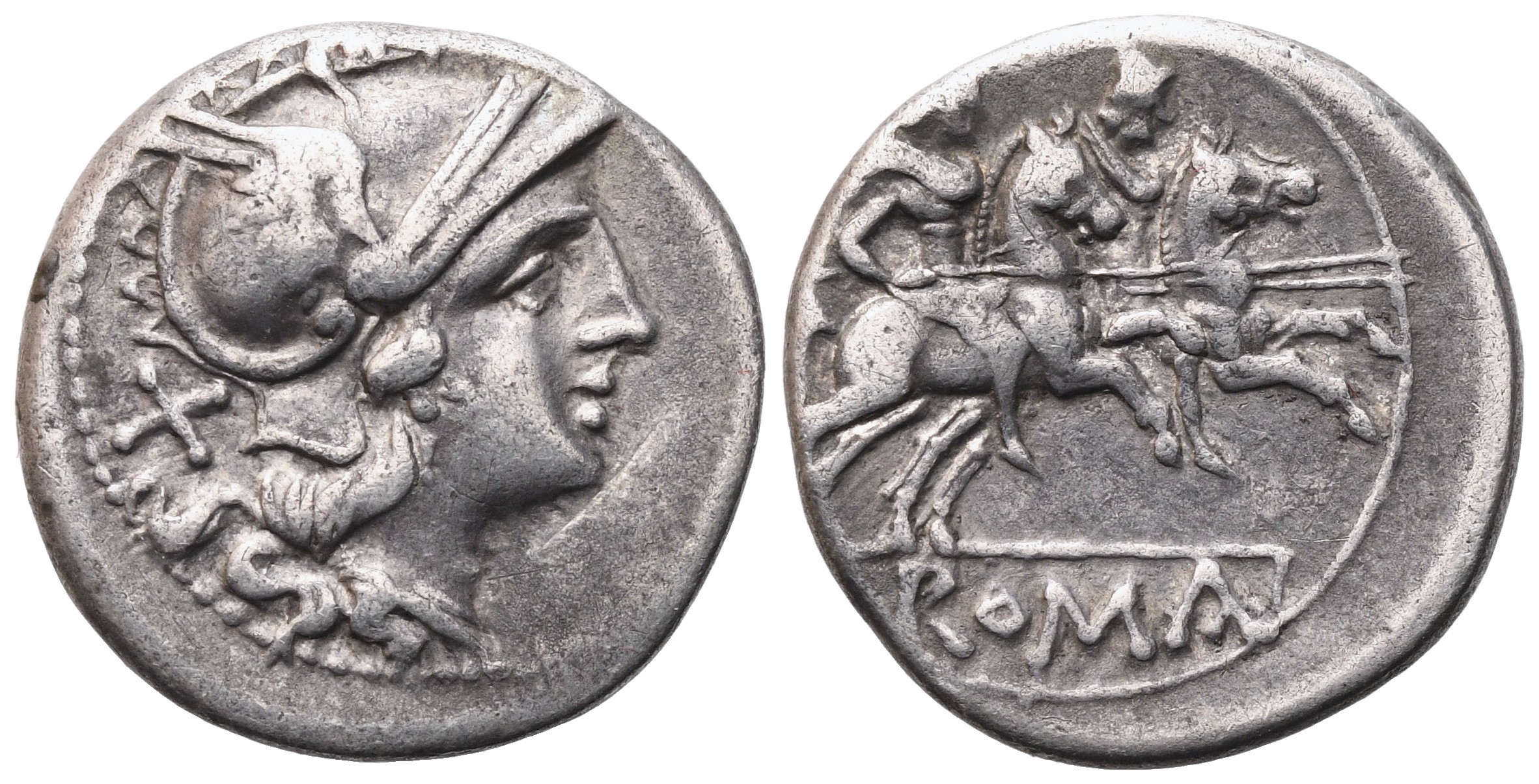 Helmeted bust of Roma r.; behind, X (mark of value); Rv. Dioscuri on horseback r., each holding spear; in linear frame, ROMA. Crawford 139/1; Sydenham 338. Good very fine.