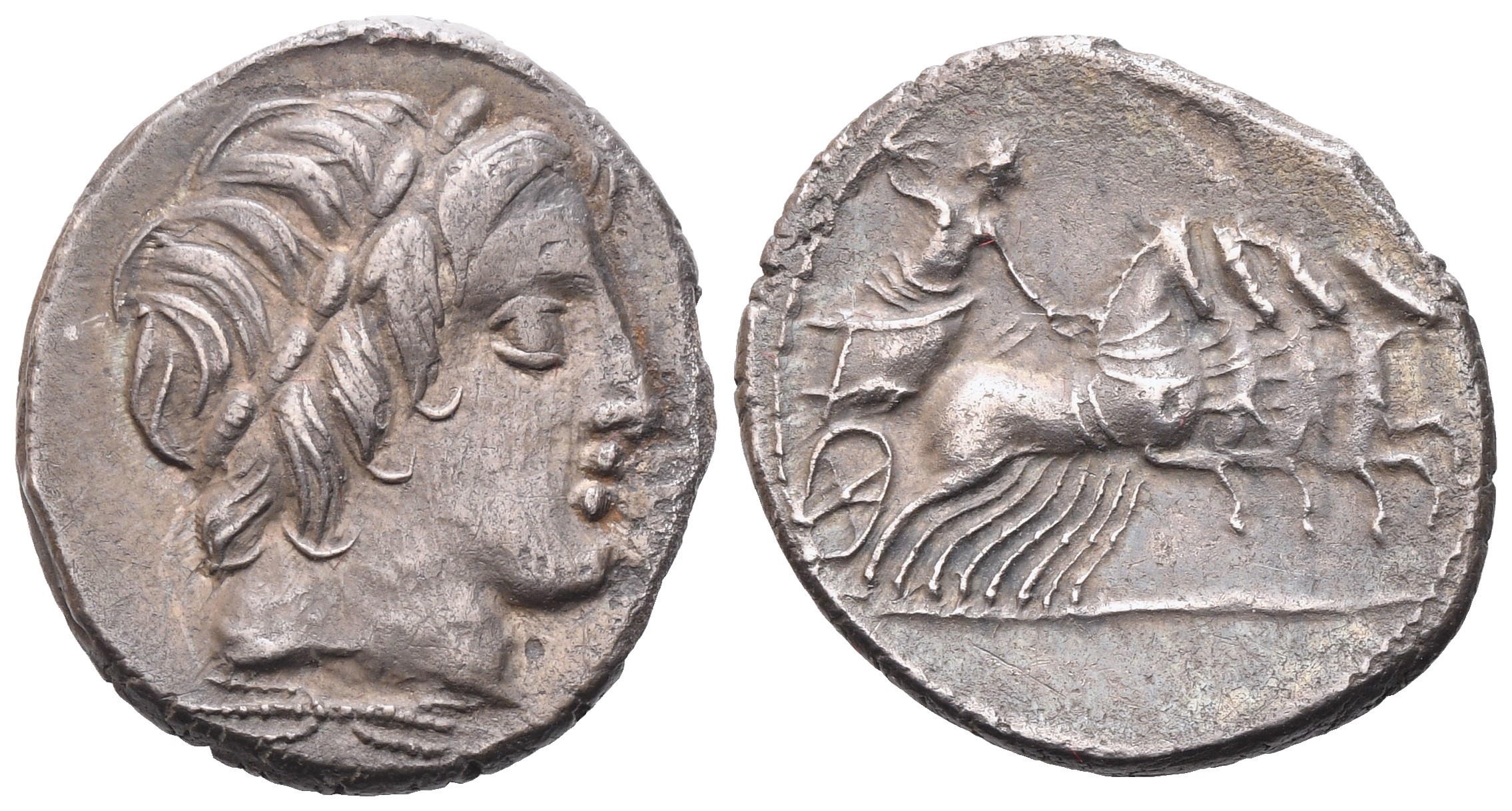 Wreathed head of Apollo r.; below neck truncation, thunderbolt; Rv. Jupiter in fast quadriga to r., holding reins in his left hand and hurling thunderbolt with his right. Crawford 350A/2; Babelon (Anonyme) 226; Sydenham 723. Very fine.