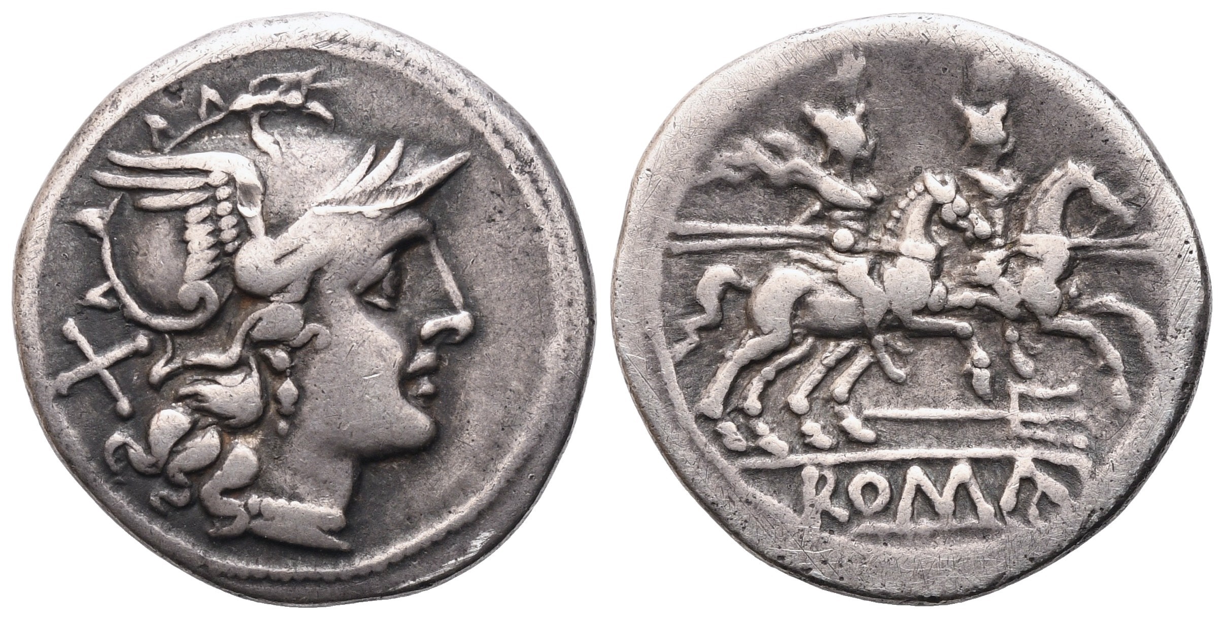 Helmeted head of Roma r; behind X- Dioscuri galopping r.; below, trident; ROMA in exergue. Crawford 115/1. Good very fine.